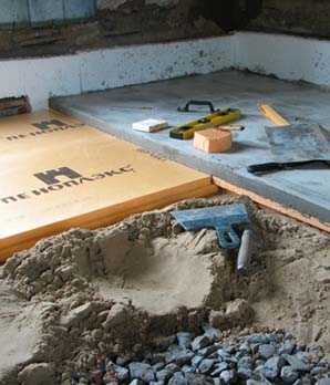При стяжке пола используется рулонная или обмазочная гидроизоляция и теплоизоляция. Первые вариант укладывается с нахлестом в 10 сантиметров, а второй вариант является обмазочной изоляцией, которая наносится на поверхность валиком. Этим ограничивается возможность пересыхания стяжки и появления на ней трещин.