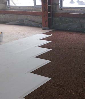 - Плавающей. Этот вид заключается в укладывании раствора на тепло-, гидро- и звукоизолирующие слои или плиты. Имеющий повышенную плотность полиетилен или бумага, которая пропитывается битумом или маслом. При использовании пробковых или полистирольных напольных плит, матов из минерального волокна или стекловолокна гарантируется тепло- и звукоизоляция.