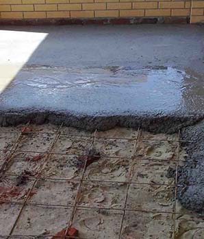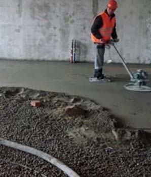 На следующем этапе по основанию распределяется необходимое количество цементно-песчаной смеси. Для ее выравнивания используется правило. Во избежание образования трещин нарезаются деформационные швы. После высыхания раствора специальной затирочной машиной проводится шлифовка поверхности.
