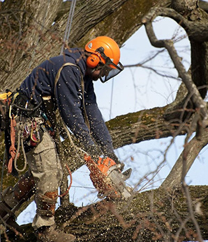 В тех случаях, если дерево – аварийное. Данный способ будет дороже и требует специального снаряжения для подъёма на дерево и для организации оттяжки. Также необходимо иметь свободный радиус 5-10 метров для падения дерева, во избежание нанесения вреда окружающим.